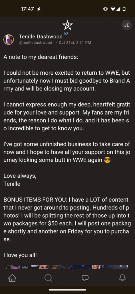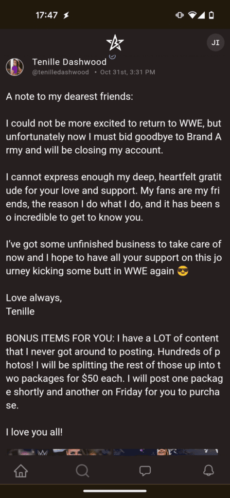 Emma took to her paywall on Tuesday and announced that she’ll be shutting down her premium content page in the wake of her WWE return. The real-life Tenille Dashwood expressed her gratitude to her fans for all the love and support. Read the complete announcement below.