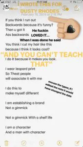 Amore recently uploaded a few pages of notes from one of Dusty Rhodes’ promo classes. He inserted a few notes to help point out some things. But by reading this you can see how this helped Enzo’s character come to life with some help from Dusty Rhodes.