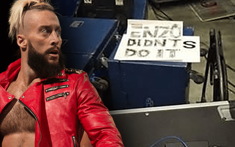 An individual that attended Monday’s RAW at Honda Center in Anaheim, CA decided it was a brilliant idea to make a sign that referenced the rape accusations against Enzo Amore and bring it to the show. The sign that read, “Enzo didn’t do it,” was briefly shown during the broadcast and WWE probably wasn’t very happy about this because the sign was quickly confiscated.