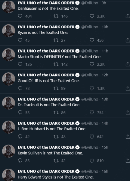 Uno dropped tons of tweets over the past day. Each of them reveals who the Exalted One isn’t. He listed everyone from Ron Funches to Hangman “Adam Page.”