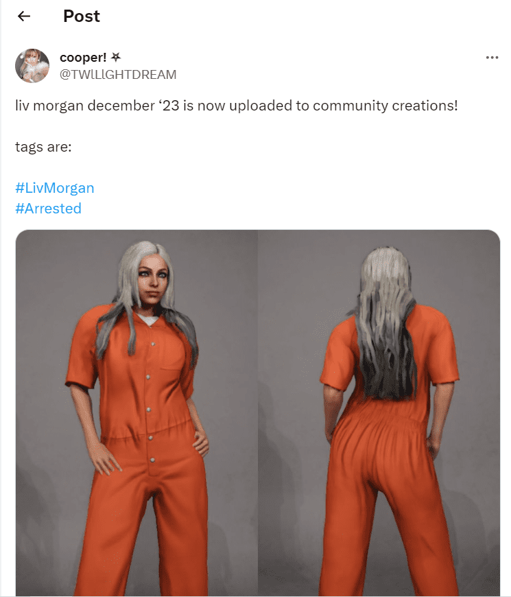 In a creative and somewhat tongue-in-cheek response to the situation, a fan took to Twitter to share images of Liv Morgan in WWE 2K23 wearing jail attire. The fan mentioned that this custom skin was added to the community creations, showcasing the WWE Universe’s unique way of expressing their support for Liv Morgan during this trying time.