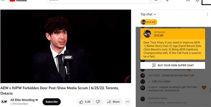 Odds are, Tony Khan will never read that SuperChat, but he might now. After all, he’s much more likely to read Ringside News than a SuperChat on AEW’s YouTube page.