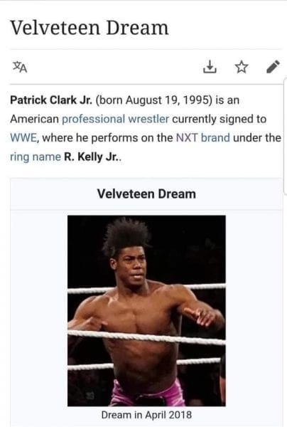 Dream’s Wikipedia entry was edited and for a brief time it showed that his ring name is “R Kelly Jr.” Of course, we all know what R Kelly allegedly did. Dream didn’t allegedly do all of the same things, but it was apparently close enough for whoever edited his page.