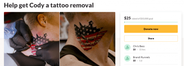 A Go Fund Me page has been started to get Cody Rhodes’ tattoo removed. They are nowhere close to their $10,000 goal, but Brandi Rhodes did seem to chip in five bucks. You can read the description below.