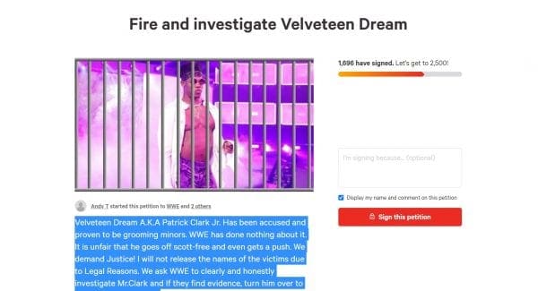 Velveteen Dream A.K.A Patrick Clark Jr. Has been accused and proven to be grooming minors. WWE has done nothing about it. It is unfair that he goes off scott-free and even gets a push. We demand Justice! I will not release the names of the victims due to Legal Reasons. We ask WWE to clearly and honestly investigate Mr.Clark and If they find evidence, turn him over to the Proper Authorities.