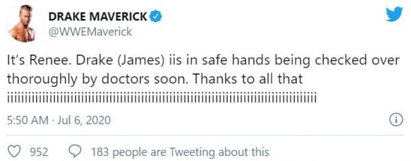 A tweet was released just before 6:00 AM claiming to be from Renee Michelle, Drake Maverick’s wife. This tweet provided no information except that Drake Maverick is “in safe hands being checked out thoroughly by doctors soon.”