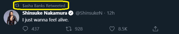 Shinsuke Nakamura tweeted out “I just wanna feel alive.” This was interpreted by the IWC in various ways. Interestingly enough, Sasha Banks retweeted Nakamura.