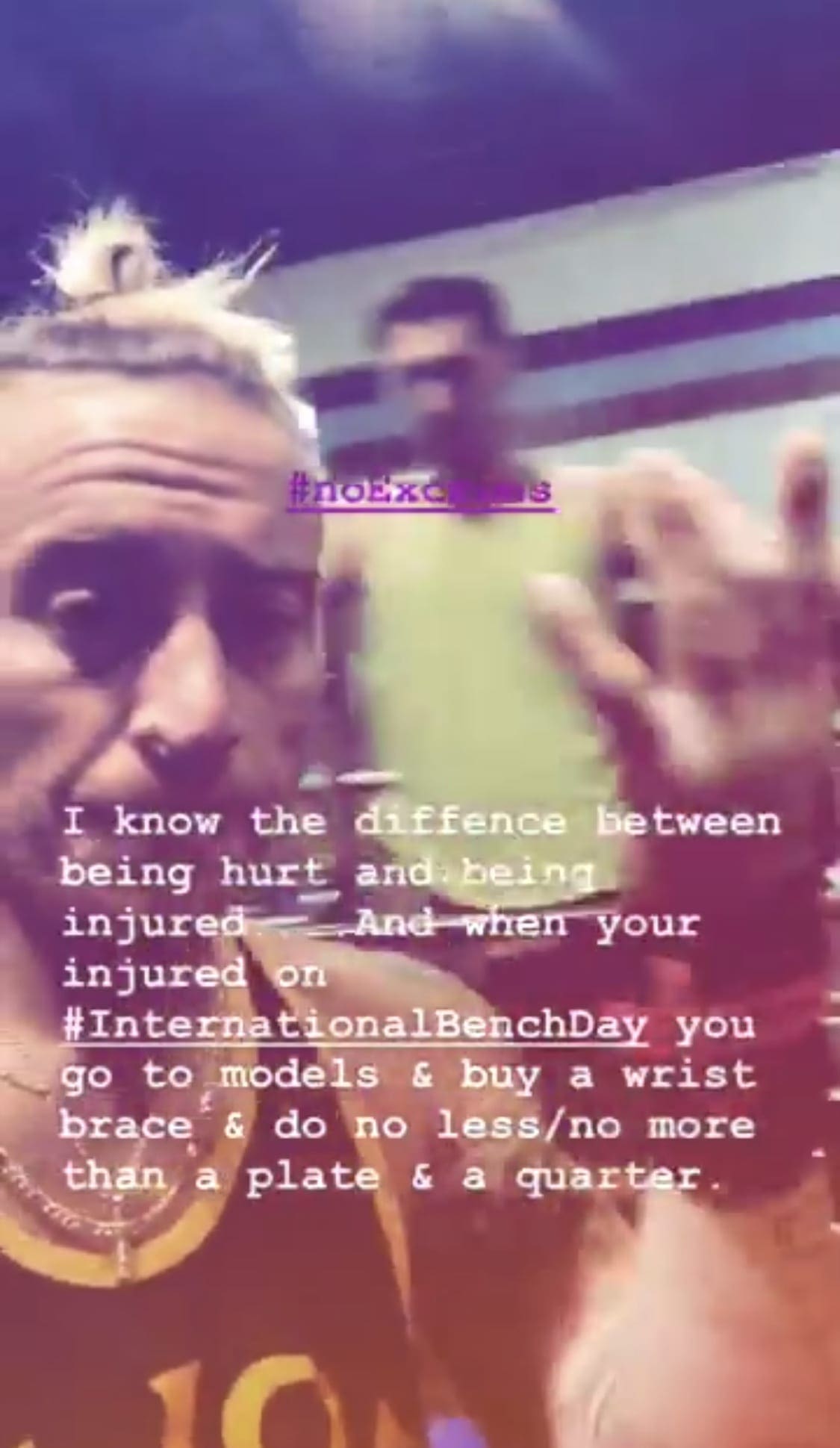 Amore included a video of himself pressing on in the gym with a damaged wrist with writing saying: “I know the difference between being hurt and being injured. And when you’re injured on #InternationalBenchDay you go to models & buy a wrist brace & do less/no more than a plate & a quarter.”