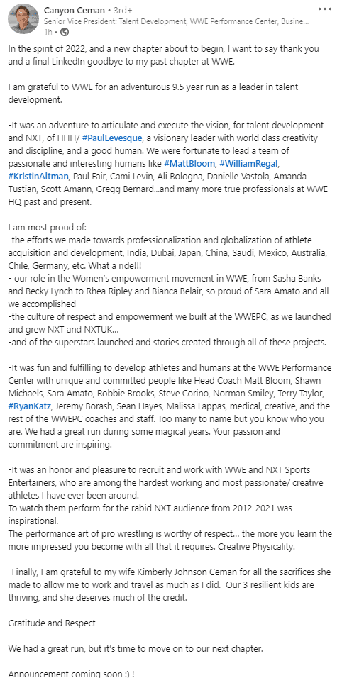 “In the spirit of 2022, and a new chapter about to begin, I want to say thank you and a final LinkedIn goodbye to my past chapter at WWE.