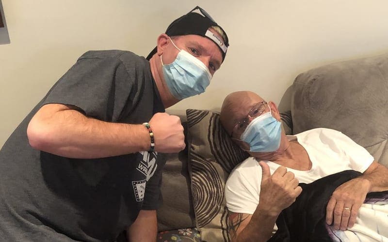 “Saw my buddy Gillberg today. He’s home recovering and doing well,” James Ellsworth said. They both posed for a masked photo-op as well.