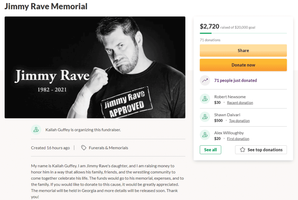 "My name is Kailah Guffey. I am Jimmy Rave's daughter, and I am raising money to honor him in a way that allows his family, friends, and the wrestling community to come together celebrate his life. The funds would go to his memorial, expenses, and to the family. If you would like to donate to this cause, it would be greatly appreciated. The memorial will be held in Georgia and more details will be released soon. Thank you!