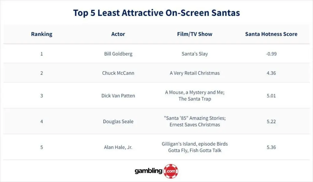 Nearly 17 years after the release of Santa’s Slay, Goldberg finds himself on the top of the list of ugliest on-screen Santas. According to a recent study, the WWE star is the only Santa Clause actor to get a negative rating on the Santa Hotness Score.
