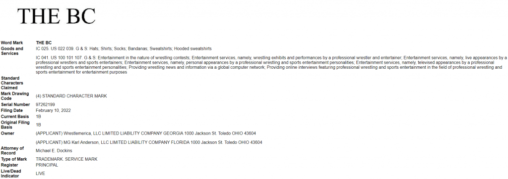 That could be the reason that Gallows and Anderson filed their latest trademark. According to the US Patent and Trademark Office, “The BC” was registered for legal protection on February 10, 2022. The listing reads as follows: