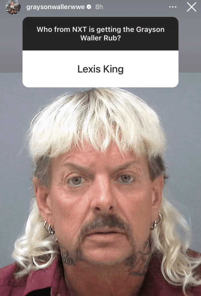 Lexis King brought a whole new look after becoming a star in NXT, something that has made him become a subject of ridicule – especially because of the way he cut his beard. Waller took to his Instagram story and answered a question where he was asked which NXT Superstar will get the Grayson Waller rub next. Waller named Lexis King while using a photo of ‘Tiger King’ star Joe Exotic.