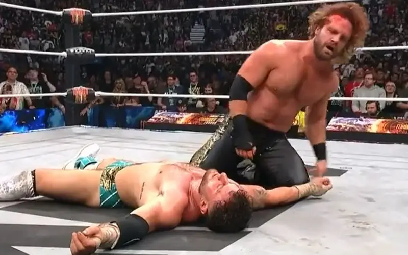 Hangman Page took a tombstone from MJF on the broken table to bust him open the hard way. He laid on the outside of the ring and nearly broke a ten count. After that, MJF was busted open in a big way, and he bled all over the ring after taking a shot from Hangman in the ring. Fans chanted “you deserve it,” as MJF started to bleed thanks to the exposed turnbuckle.