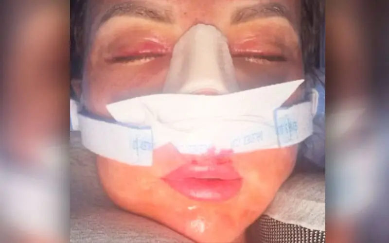 The photo showed her with her eyes swollen shut, bandages covering her face, and visible blood on her lips. Alongside the image, she dropped a chilling caption.