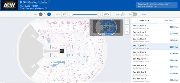 To make matters even more interesting, AEW opened up more tickets very recently after more seats were opened up after production was figured out. Ticket Master is currently listing tickets available all over the building including a few sections with “100+” tickets available making it impossible to add up.