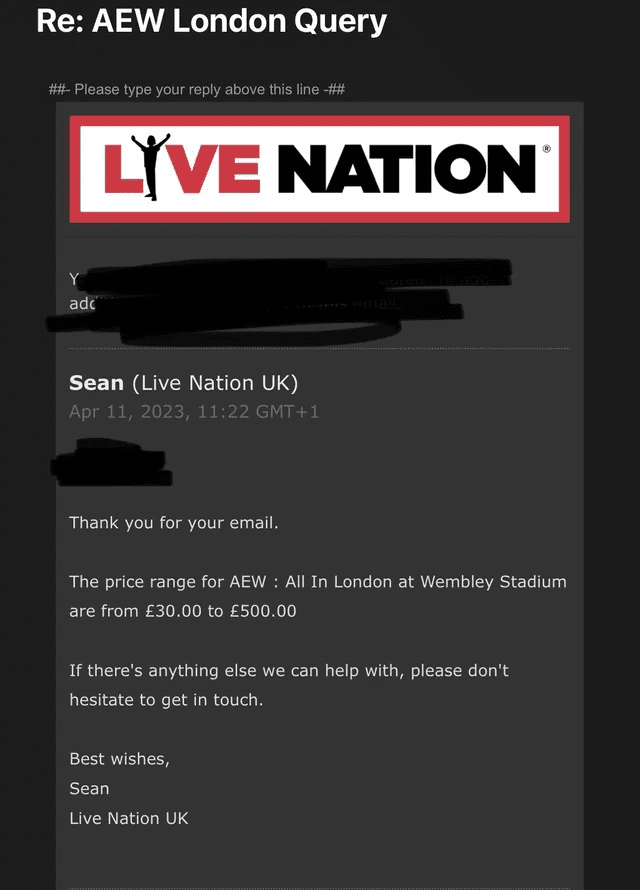According to Reddit user riyadpo, it was revealed that the ticket prices for the upcoming All In Event will range from £30 to £500. The user then noted that they are also trying to get prices for all the different tiers.