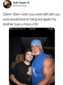 Instead, Hogan included a picture of himself with Bam Margera saying, “Damn Bam, I wish you were still with us, I sure would love to hang out again my brother love u miss u HH.”