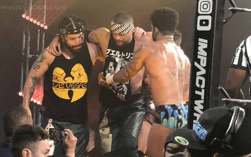 Santana went down during his triple threat Impact Wrestling Tag Team Championship match. He was holding his left knee the entire time and didn’t get back in the match after Konnan brought attention to him by throwing up the dreaded X.