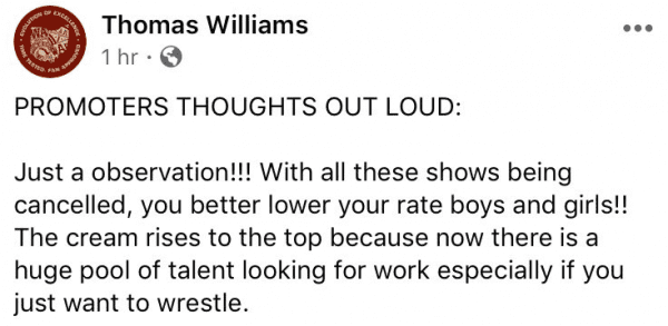 Thomas Williams of War Wrestling had an “observation” about the current state of the pro wrestling business. He suggested that with all of the shows being cancelled that “you better lower your rate boys and girls!!”