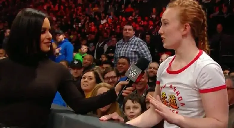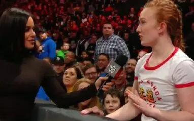 PW Insider reports that this was a paid actor plant at ringside. So she was asking about what Bayley and Sasha Banks would change about the RAW Women’s Division because that was the line given for her to say.