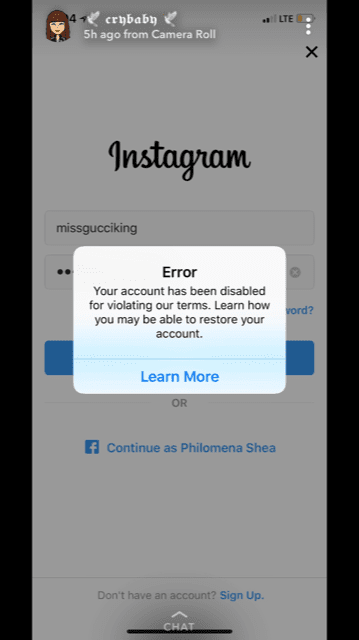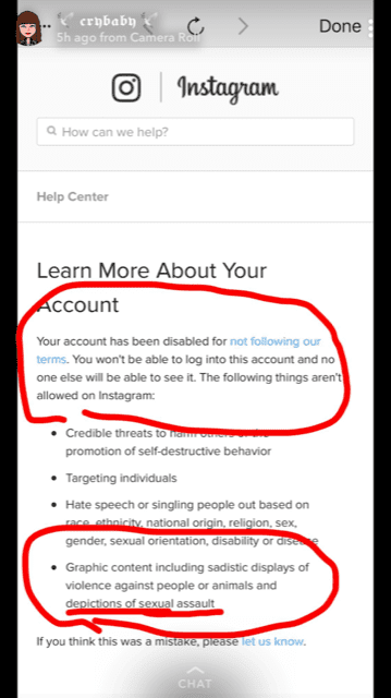 Photo #3: Sheahan highlights Instagram notifying her that her account’s disabled for not following Instagram’s terms. She highlighted where it stats one cannot depict sexual assault.