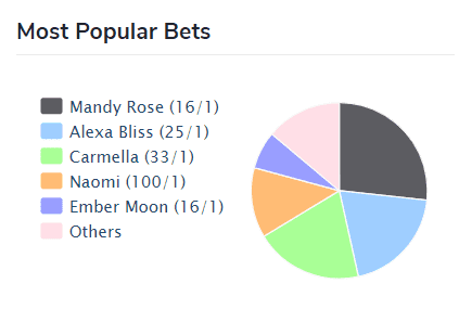 As you can see from the chart below, Mandy Rose is the most popular choice with 16/1 odds. Ember Moon is also sitting with 16/1 odds, but she’s not as popular of a bet. It’s unclear when Moon will be back from her current injury.