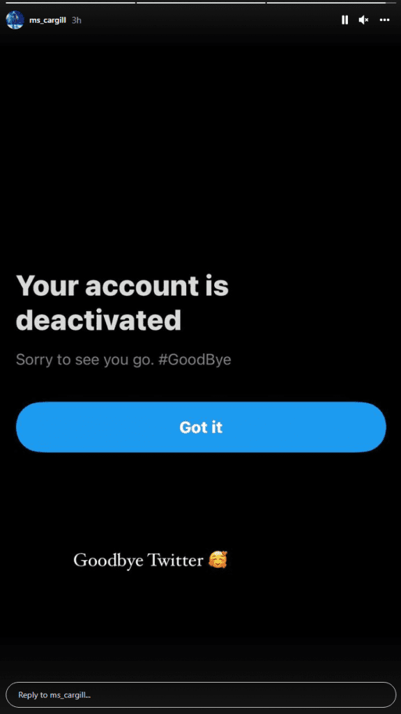 Cargill posted the news to her Instagram story. The Instagram account is still active. Jade posted a screen shot after she deleted the Twitter account. She captioned it, “Goodbye Twitter.”