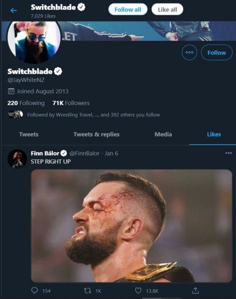 Switchblade Jay White didn’t reply to Finn Balor’s tweet, but he did smash the like button. This is interesting because Jay White doesn’t like a ton of things on Twitter. This social media activity was obviously on purpose.