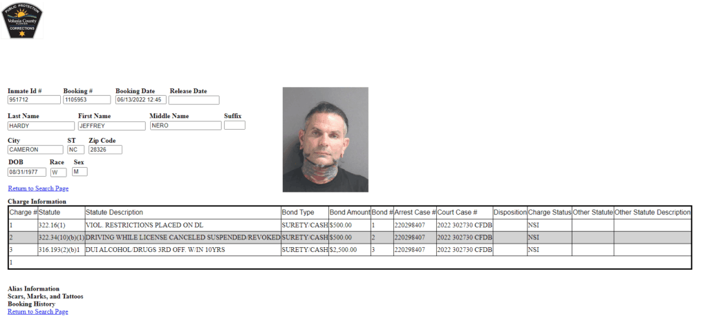 According to the Volusia County Division of Corrections, Jeff Hardy was booked today on charges of driving under the influence. Hardy was also charged with driving with a suspended license. Jeff is still listed as in custody.
