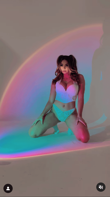 The video shows Jessica McKay striking a beautiful pose for the camera. McKay can be spotted wearing white lingerie and in a bending pose behind a white background with slightly vibrant color lighting.