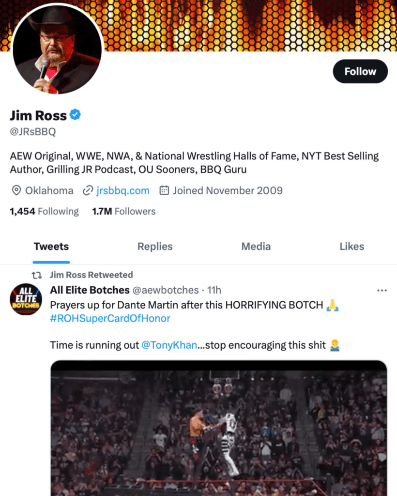 During the ROH Supercard of Honor event, Dante Martin suffered an injury during a scary spot. Many people were vocal against AEW for allowing such accidents to even happen in the first place. As it turns out, Jim Ross seems to have liked a tweet from a page called All Elite Botches, which condemned Martin’s injury.