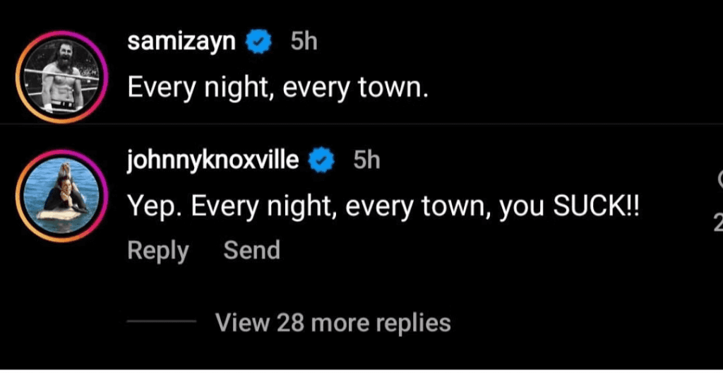The most recent instance of this trolling from Johnny Knoxville was found in the remarks section of a recent Instagram post by The Honorary Uce. Zayn posted a photo from a live concert with The Usos and Solo Sikoa, two members of his Bloodline stable. Sami Zayn’s caption was stolen by Johnny Knoxville, although he added the phrase “you suck” at the end.