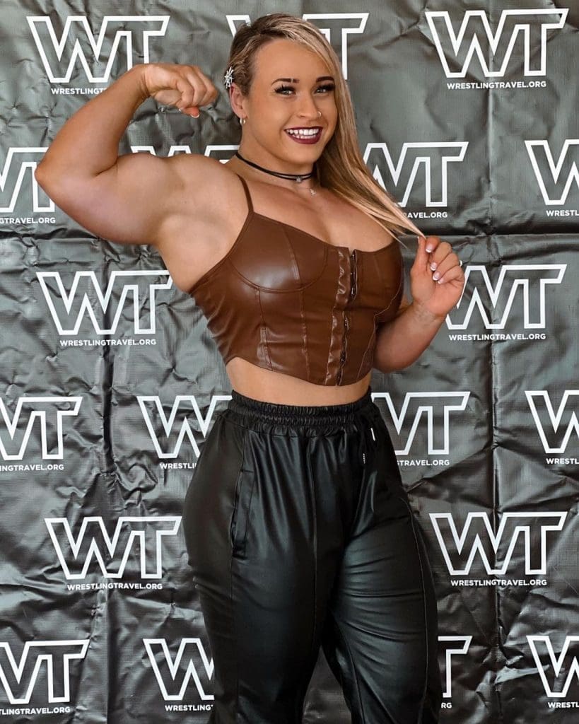 Jordynne recently took to her Instagram to show off her red carpet flex. She can be seen flexing her biceps in Dallas before the show kicks off. Jordynne rocked a small brown leather tank top and a pair of jet black track pants.