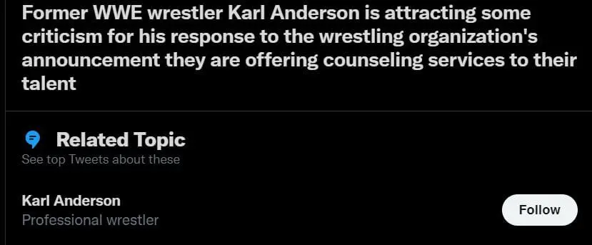 Former WWE wrestler Karl Anderson is attracting some criticism for his response to the wrestling organization's announcement they are offering counseling services to their talent