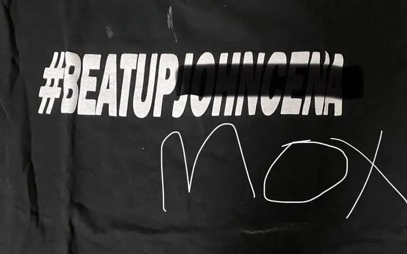 Karl Anderson tweeted out a photo of a t-shirt that said: “#BeatUpMox.” Mox was covering up a #BeatUpJohnCena design.
