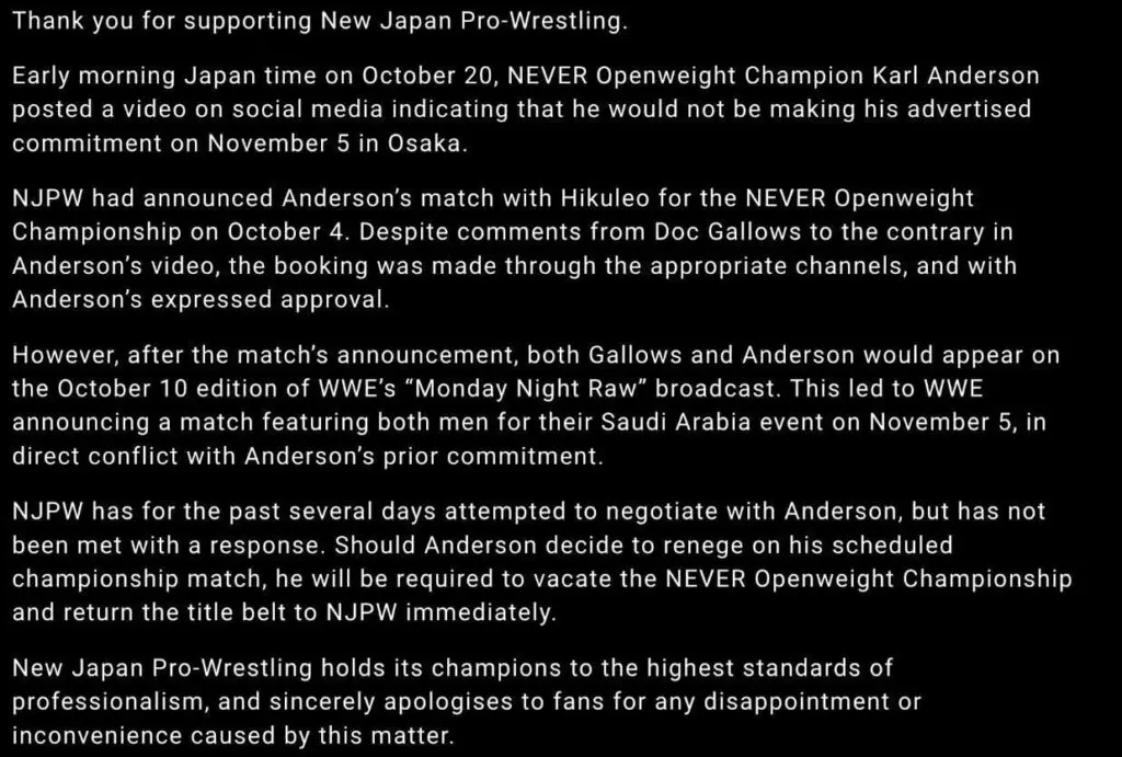 NJPW had announced Anderson's match with Hikuleo for the NEVER Openweight Championship on October 4. Despite comments from Doc Gallows to the contrary in Anderson's video, the booking was made through the appropriate channels, and with Anderson's expressed approval.
