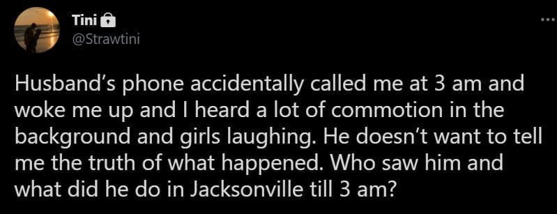 Husband’s phone accidentally called me at 3 am and woke me up and I heard a lot of commotion in the background and girls laughing. He doesn’t want to tell me the truth of what happened. Who saw him and what did he do in Jacksonville till 3 am?