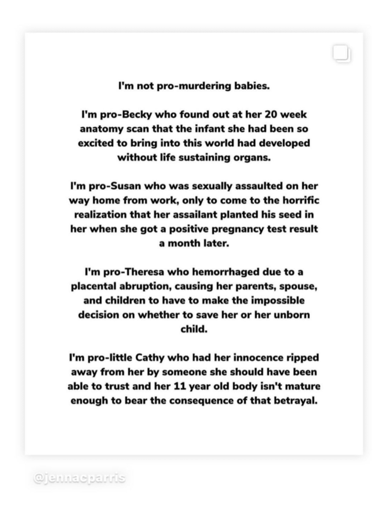 “I’ll also add – I am a product of rape. My mother was raped by a stranger – to this day, neither of us have any clue who my birth dad is. She chose to have me – clearly – but she did so because she CHOSE to. Not because a law told her she HAD to. It should always be our choice.”