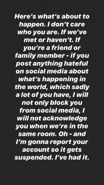 Here’s what’s about to happen. I don’t care who you are. If we’ve met or haven’t. If you’re a friend or family member — if you post anything hateful on social media about what’s happening in the world, which sadly a lot of you have, I will not only block you from social media, I will not acknowledge you when we’re in the same room. Oh — and I’m gonna report your account so it gets suspended. I’ve had it.”