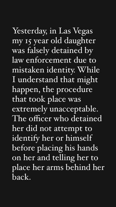 Yesterday, in Las Vegas my 15 year old daughter was falsely detained by law enforcement due to mistaken identity. While I understand that might happen, the procedure that took place was extremely unacceptable. The officer who detained her did not attempt to identify her or himself before placing his hands on her and telling her to place her arms behind her back.