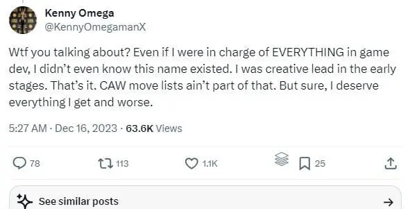 "Wtf you talking about? Even if I were in charge of EVERYTHING in game dev, I didn’t even know this name existed. I was creative lead in the early stages. That’s it. CAW move lists ain’t part of that. But sure, I deserve everything I get and worse."