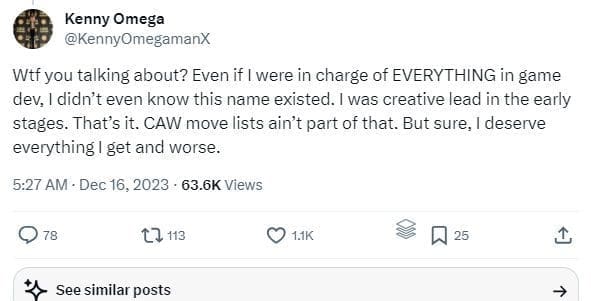 “Wtf you talking about? Even if I were in charge of EVERYTHING in game dev, I didn’t even know this name existed. I was creative lead in the early stages. That’s it. CAW move lists ain’t part of that. But sure, I deserve everything I get and worse.“