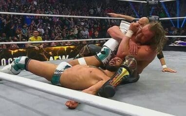 Omega nailed a V-Trigger on both of his challengers, sending Speedball out of the ring. Then Ricochet reversed out of a One Winged Angel, but Omega was able to counter into a German Suplex for a near fall. There were a ton of near falls after that, as everyone in the match had a time when it looked like they might win. That included Speedball hitting a Crane Kick straight out of Karate Kid.