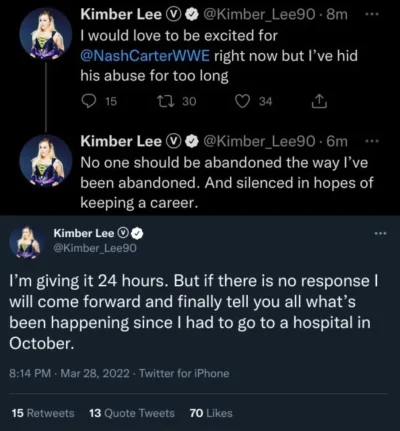 Original: IMPACT star Kimber Lee has accused her husband, NXT Tag Team Champion Nash Carter, of physically abusing her while he was drunk. She took to Twitter to detail how she experienced the abuse and how Carter justified it.