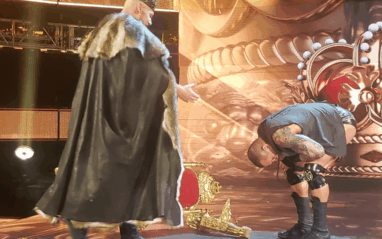 WWE held their RAW season premiere tonight and it ended with King Corbin and Randy Orton watching the main event on the stage. Too bad they didn’t invest in a better throne for King Corbin.
