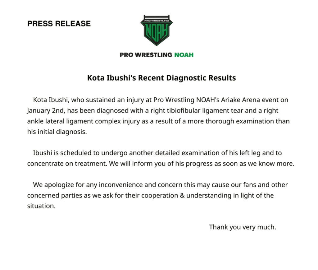 In light of Kota Ibushis’s infamous match, Pro Wrestling NOAH released a statement in a press release, where the full extent of his injuries was revealed. It was noted he was diagnosed with a right tibiofibular ligament tear and a right ankle lateral ligament complex injury.