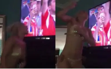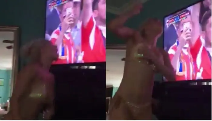 Russia scored a goal and Lana was so happy about it she jumped for joy. The only issue for her was that she was wearing a very skimpy bikini top and almost fell right out of it.