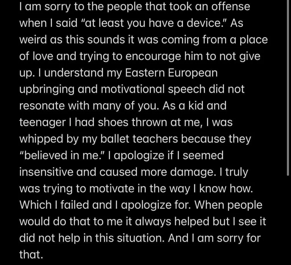 As a kid and teenager I had shoes thrown at me, I was whipped by my ballet teachers because they "believed in me." I apologize if I seemed insensitive and caused more damage. I truly was trying to motivate in the way I know how. Which I failed and I apologize for. When people would do that to me it always helped but I see it did not help in this situation. And I am sorry for that.
